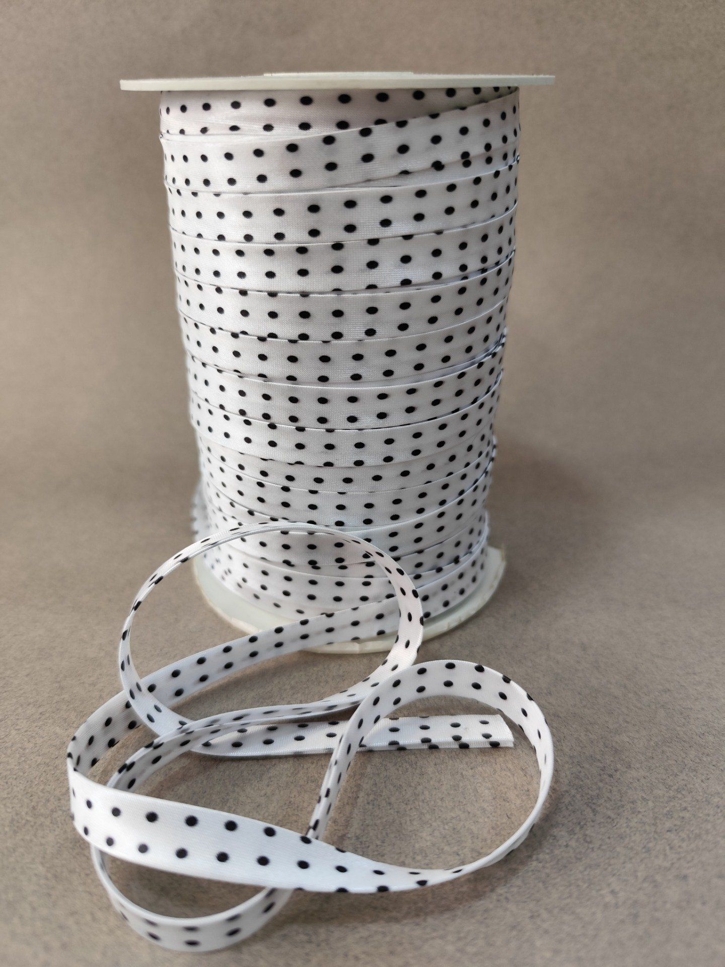 1743162-biais-satin-blanc-a-pois-noir-au-metre